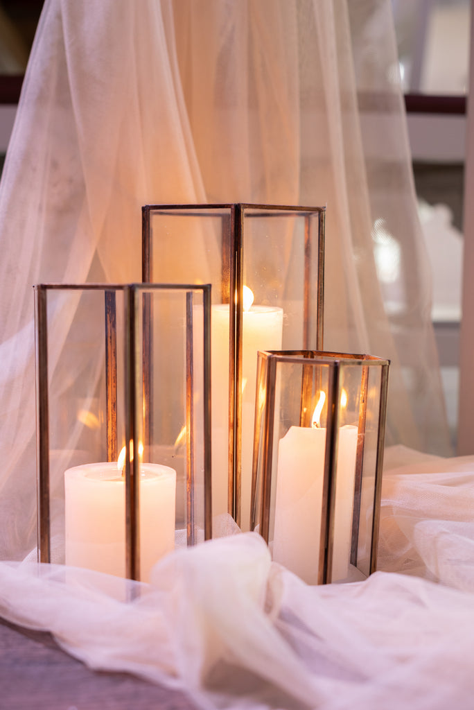 Deze hele mooie goudkleurige windlichten zijn ideaal voor een moderne, minimalistische look op je event. Deze set bestaat uit een mix van 3 verschillende formaten.