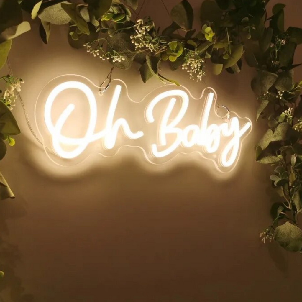 Maak een statement met deze neon lichtletters op je event. Met “Oh baby” in warm wit neon creëer je een echte eyecatcher.