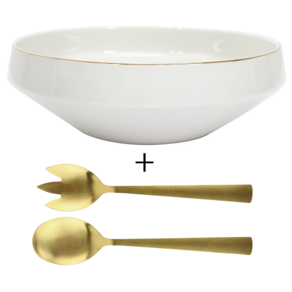 Het witte porselein wordt verfraaid met een verfijnde gouden rand in het ontwerp, wat een vleugje elegantie toevoegt aan uw tafelsetting. Deze set wordt geleverd met bijpassende slacouverts, waardoor het een complete oplossing is voor het serveren van heerlijke salades.