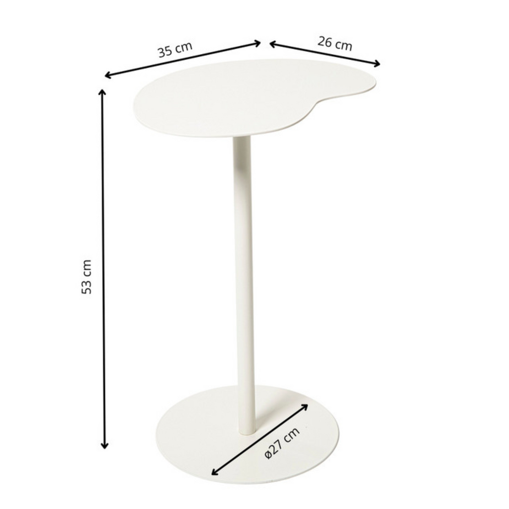 Afmeting. De bijzettafel heeft een hoogte van 53 cm, een breedte van 35 cm en een diepte van 26 cm. De voet van de bijzettafel heeft een diameter van 27 cm.