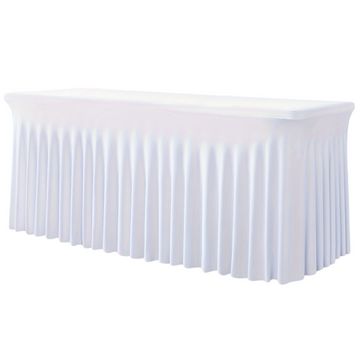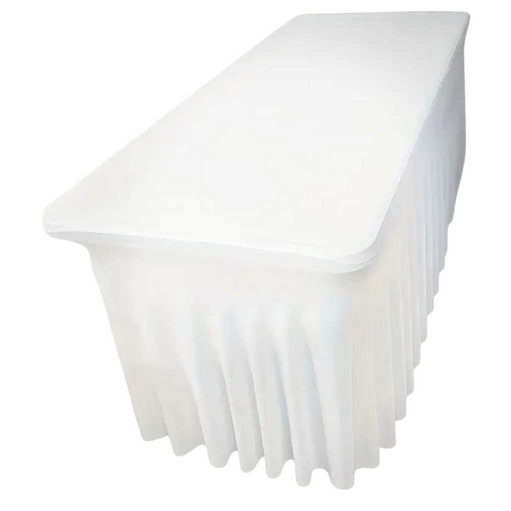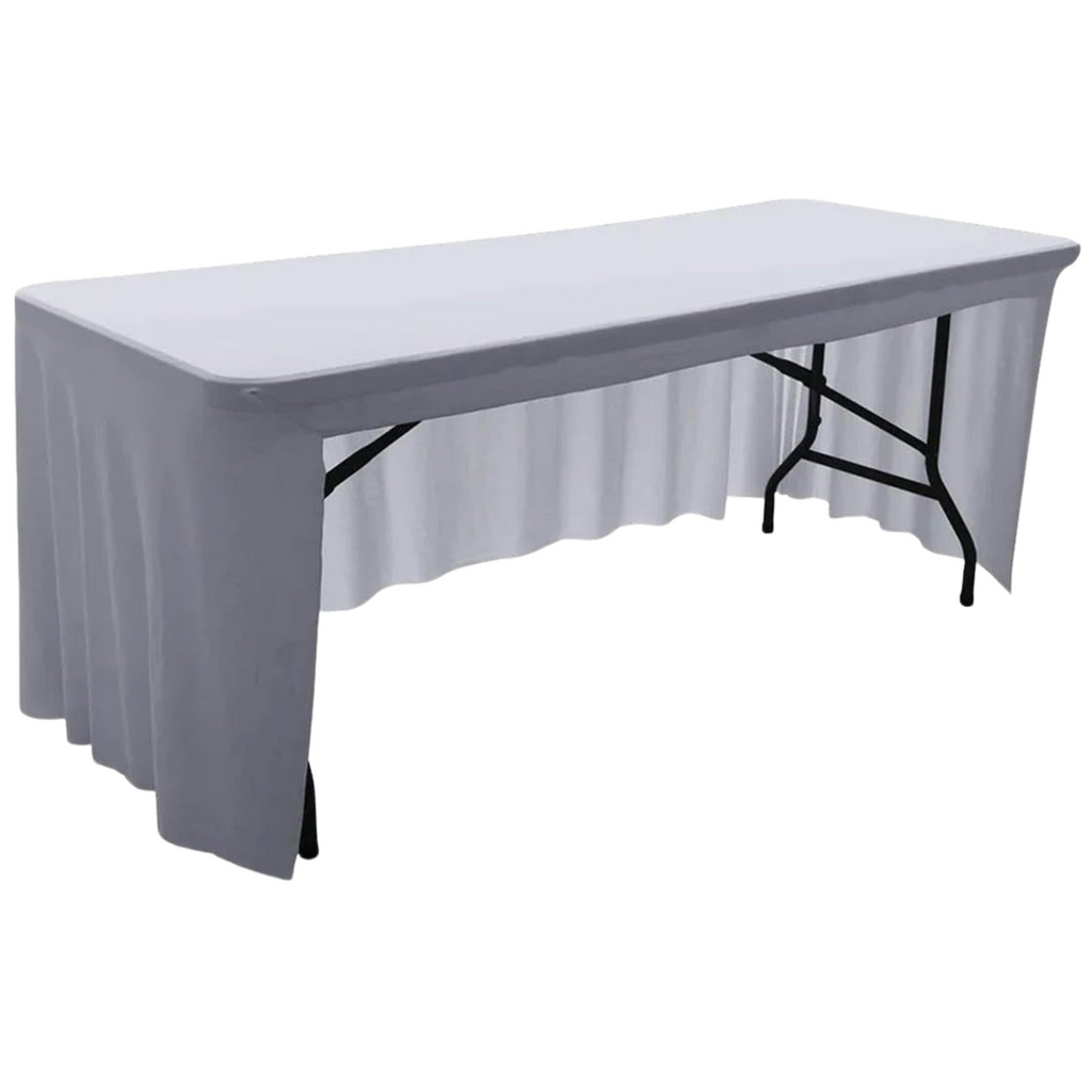Stijlvolle tafelrok die de voor- en bovenzijde van de tafel bedekt, ideaal voor een bruidstafel waarbij de achterkant open blijft om comfortabel aan te schuiven.